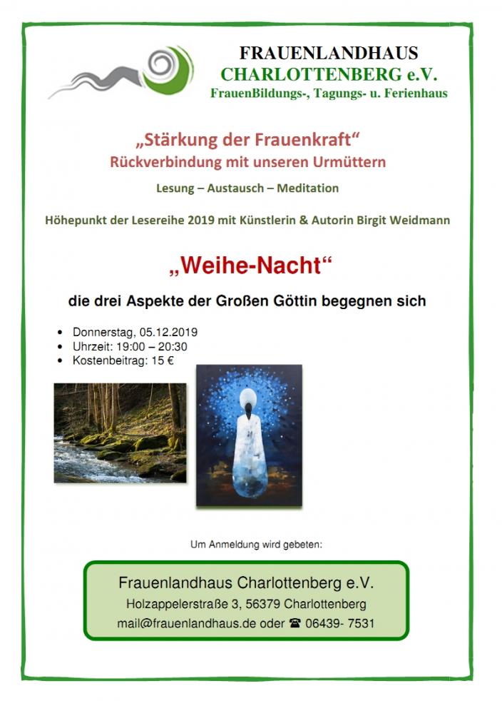 Weih (f) stammt vom indg. *uei-, „jagen“ und heißt eigentlich „Jägerin, Fängerin“ . Die Weih-Nächte sind demnach die Nächte, in denen die Jägerin oder Fängerin umherfliegt, ähnlich einer Weihe ... weiter in meinem Internet-Tagebuch oder persönlich im Frauenlandhaus Charlottenberg - dort werde ich das Thema mit einer Bilderpräsentation untermalen.